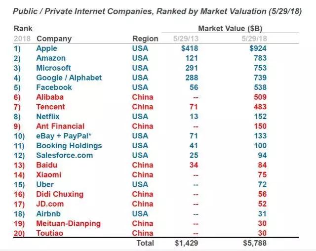 “互聯(lián)網(wǎng)女皇” Mary Meeker在2018年的報告中指出,全球20個市值或估值最大的互聯(lián)網(wǎng)公司中,以阿里巴巴為首的中國企業(yè)就占據(jù)了9家,美國有11家。