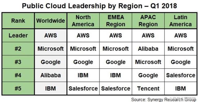 根據(jù)美國市場研究機構(gòu)Synergy Research Group發(fā)布的2018年一季度全球主要地區(qū)公有云廠商IaaS和PaaS收入排名,前五的是AWS、微軟、谷歌、阿里云和IBM,亞太地區(qū)的前五為AWS、阿里云、微軟、谷歌、騰訊云。